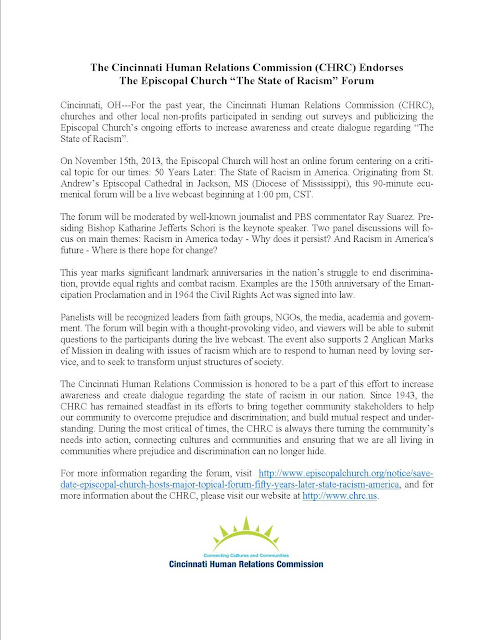 “The State of Racism” Forum Cincinnati, Ohio – For the past year, the Cincinnati Human Relations Commission (CHRC), churches and other local non-profits participated in sending out surveys and publicizing the Episcopal Church’s efforts to increase awareness and create dialogue regarding “The State of Racism”.