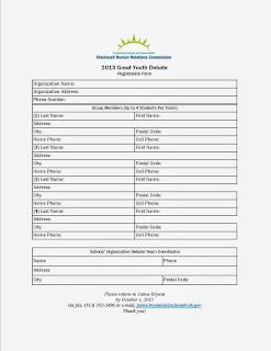 The invitation to register is open to all Greater Cincinnati high school youth. Deadline for registration is Monday, September 30, 2013. The practices are every Saturday from October 5th - November 9th, 10:00 AM - 1:00 PM at City Hall. You will learn how to debate, research, and improve your public speaking skills. Then, you will showcase your skills on Saturday, November 16th at the main event from 10:00 AM - 2:00 PM in the City Hall Council Chambers. First place teams win $400.00 and trophies. Second place teams win $300.00 and third place teams win $200.00.