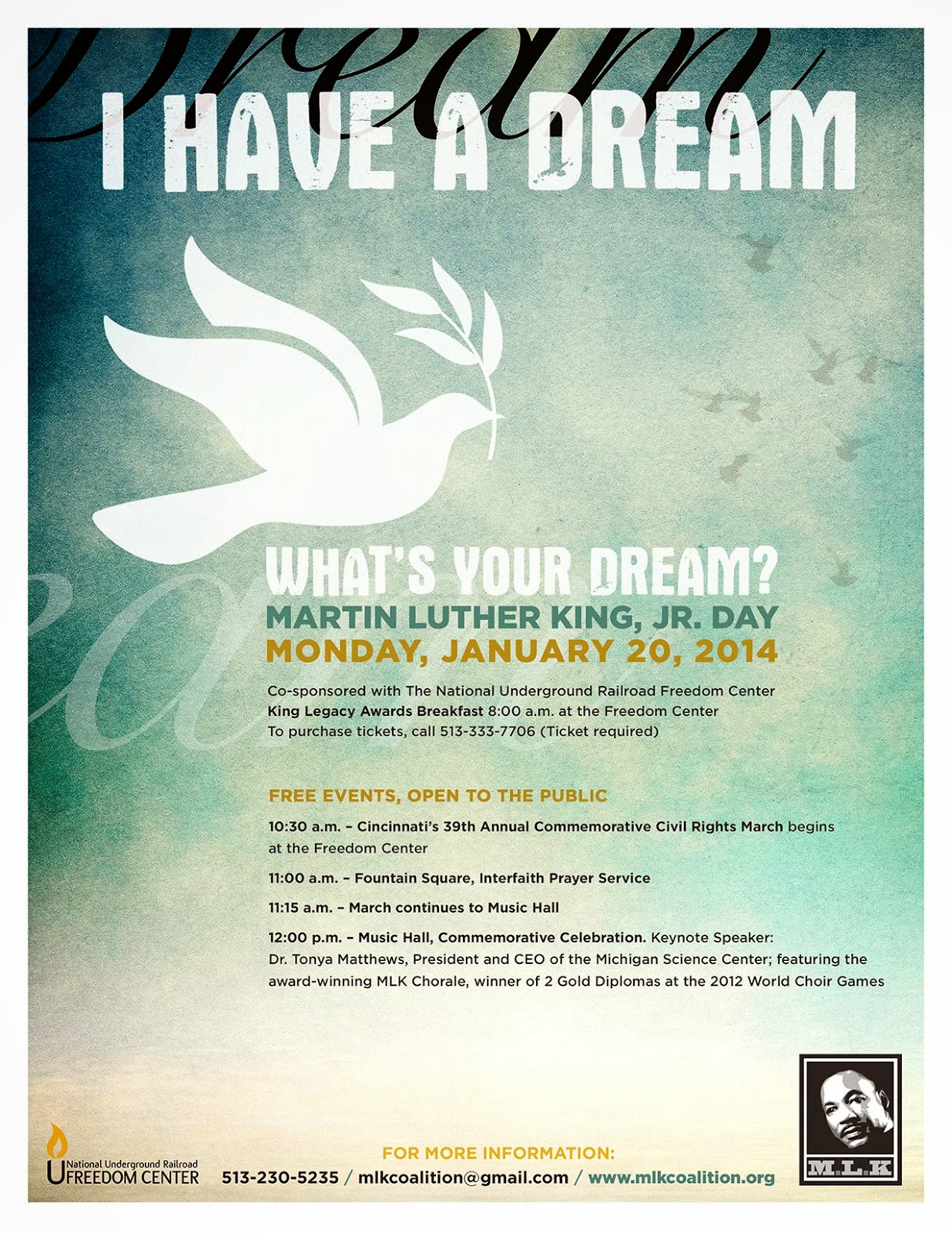 CINCINNATI, OH – January 9, 2014 – The Martin Luther King Jr. Coalition announces a series of events for Martin Luther King, Jr. Day, Monday, January 20, 2014. This is the MLK Coalition’s 39th annual celebration of the holiday in Cincinnati, dedicated to keeping Dr. King’s legacy vibrant in our community. The theme for the 2014 events is I Have a Dream, What’s Your Dream? The day is filled with opportunities for participation, commemoration and celebration.