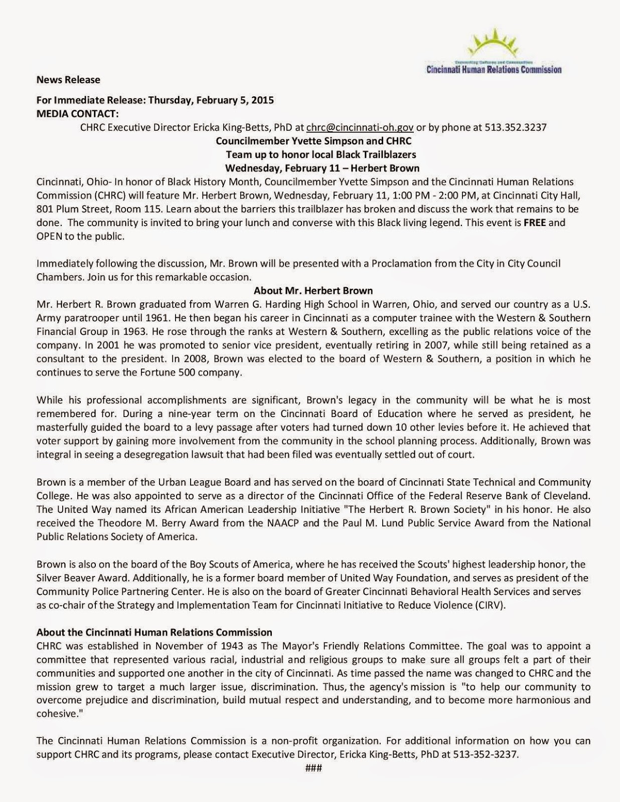 Lunch and Learn Series Celebrating Black History Month featuring Local Legend, Mr. Herbert Brown, Wednesday, February 11, 1:00 - 2:00 PM, Cincinnati City Hall, Room 115