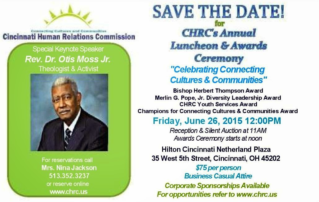 You are cordially invited to The Cincinnati Human Relations Commission (CHRC) Annual Luncheon, Silent Auction & Awards Ceremony on Friday, June 26, 2015 at the Hilton Cincinnati Netherland Plaza. Our theme is "Celebrating Connecting Cultures & Communities." There will be a light reception and silent auction from 11am-12pm followed by lunch. Corporate Sponsorship opportunities and individual tickets are available on our website: www.chrc.us or call us at 513.352.3237.