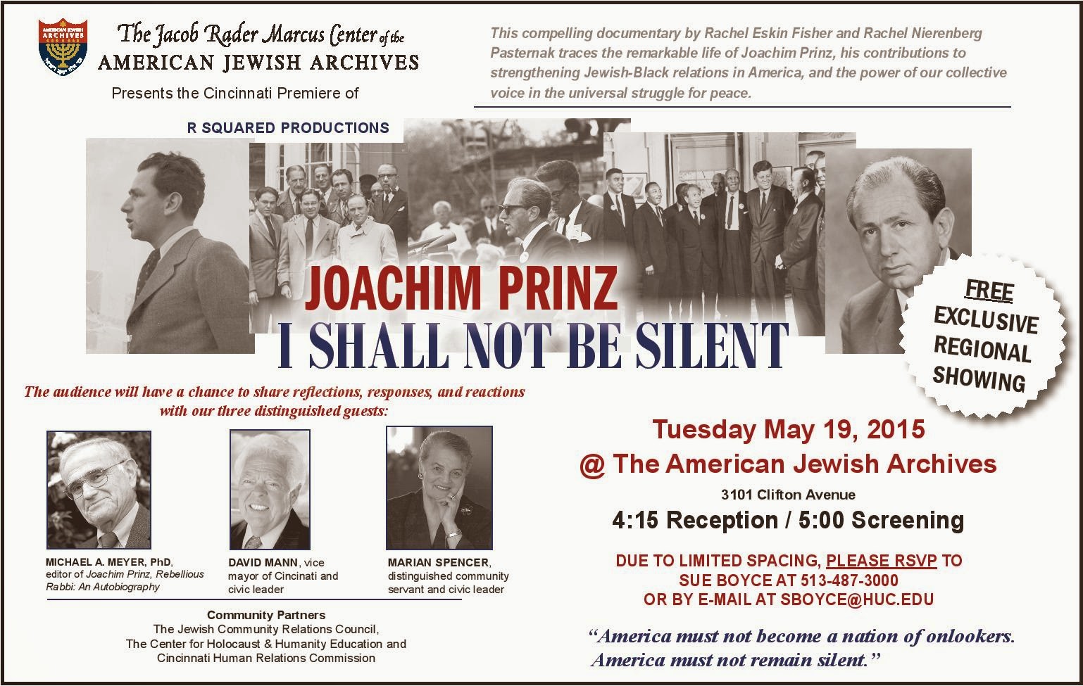 The Jacob Rader Marcus Center of the American Jewish Archives presents a FREE Screening of "I Shall Not Be Silent", Tuesday, May 19th, 5:00pm at the American Jewish Archives, 3101 Clifton Avenue. This documentary traces the remarkable life of Rabbi Joachim Prinz, and his contributions to strengthening Jewish-Black relations in America, and the power of our collective voice in the universal struggle for peace. CHRC is excited to be a Community Partner in this event.