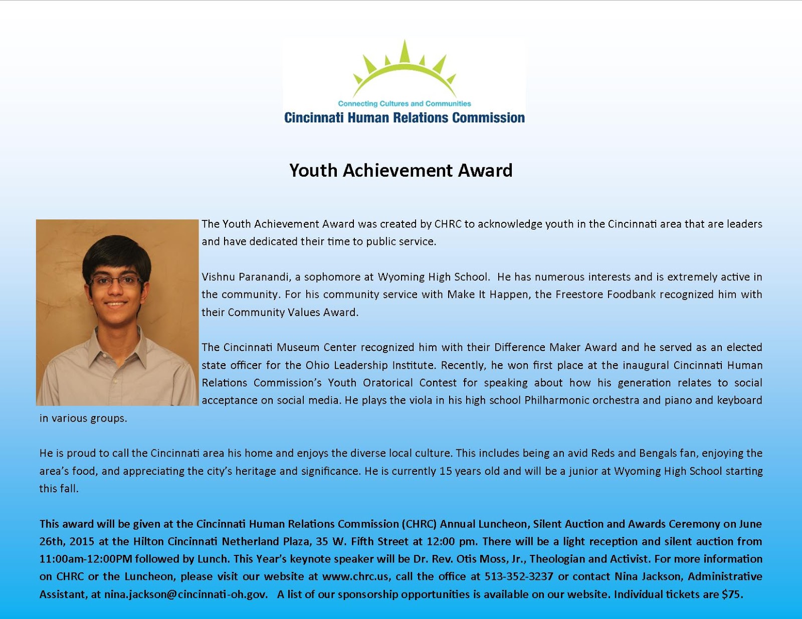 Meet CHRC Youth Achievement Award honoree Vishnu Paranandi from Wyoming HS: @OHEducation Congrats! #CHRChonors2015