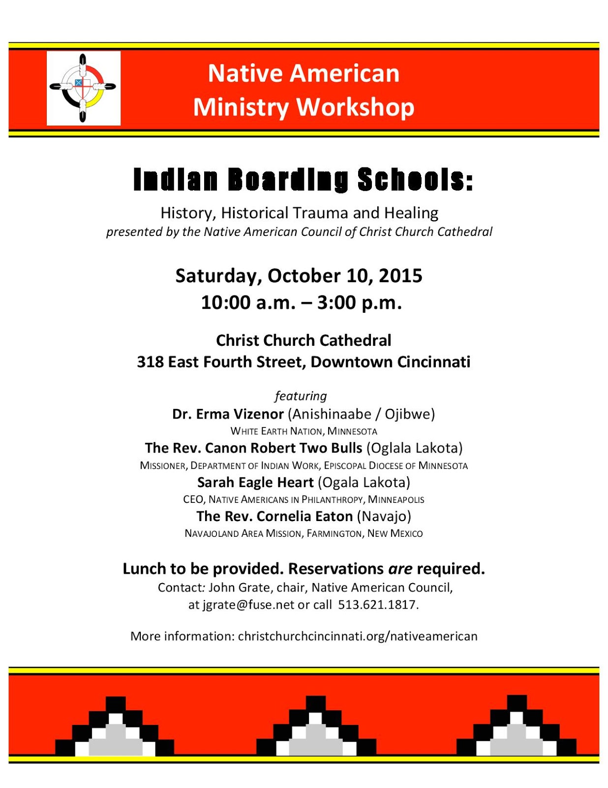 Every year, the cathedral's Native American Council holds a workshop to explore the various challenges facing Native Americans today and the ways in which people of faith can address these issues. Also every year, our nation celebrates Columbus Day. However, for some, this holiday is not a time of celebration, but serves as a painful annual remin...der of the Europeans' brutal settlement and conquest of the Americas. For this reason, CHRC is exploring efforts to transform the holiday name and supports this year's Native American workshop at the cathedral. This workshop will look at the consequences for native peoples of the European settlement, particularly in relationship to boarding schools in which Native American children were forced to enroll. Yet, the focus need not be only on the grief.