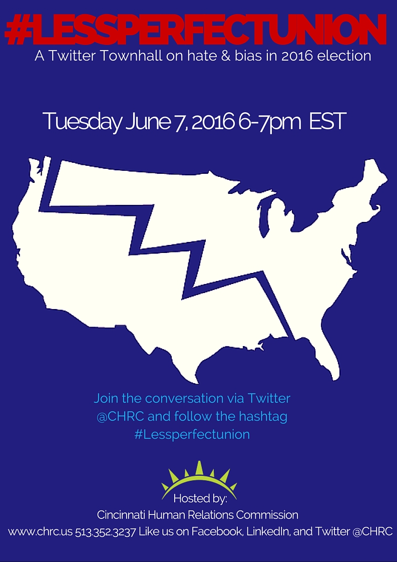 TOMORROW, Tuesday, June 7, 2016, 6-7pm, join CHRC for the latest installment in the Twitter Townhall series for #LessPerfectUnion, a public conversation about hate and bias in the 2016 election.