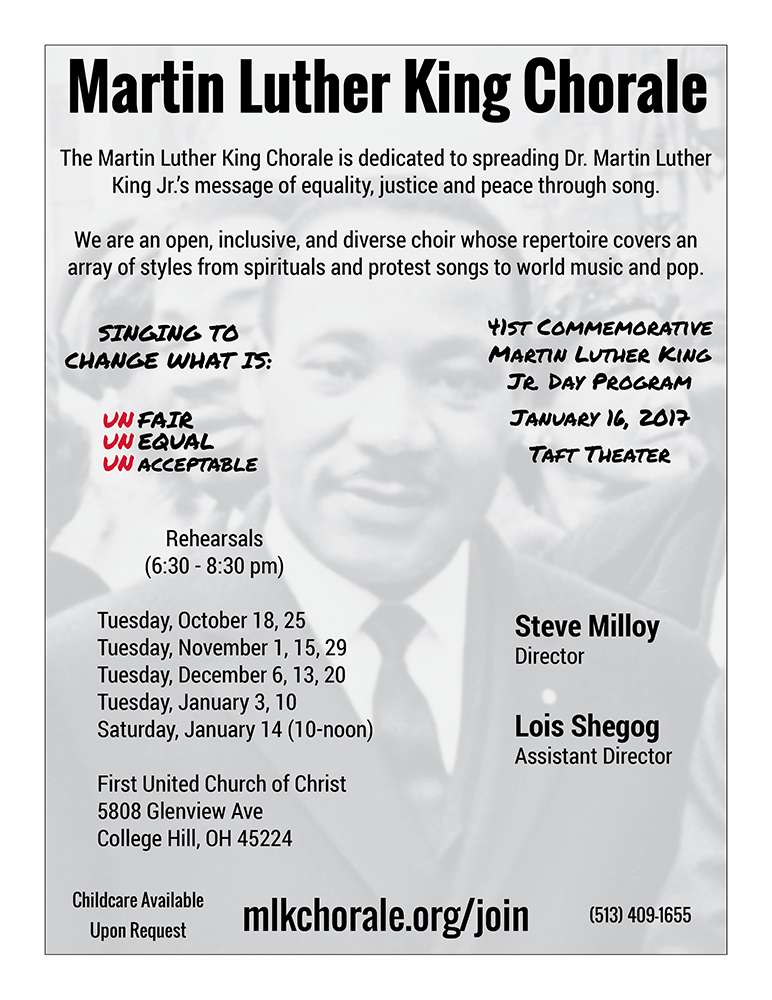 Building a vocal community for unity, the Martin Luther King Chorale rehearses in the fall and winter for the January 2017 MLK Day celebration. Rehearsals for the MLK Day 2017 event are listed on the below flyer.