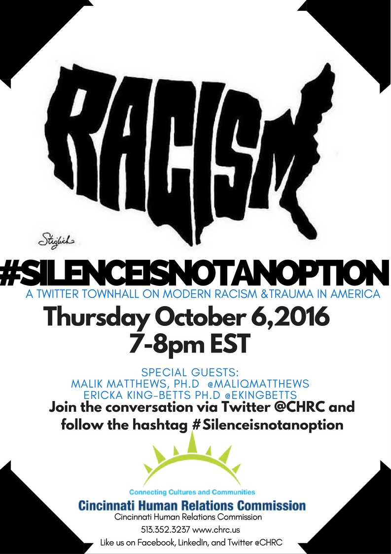 Join CHRC on Thursday, October 6, 2016, 7-8:00pm EST for the latest Twitter Townhall, #SilenceIsNotAnOption . There has been sustained debate about the “appropriate” way to confront injustice. While opinions may vary, it is certain that silence will not solve our complex institutional and social racial issues.