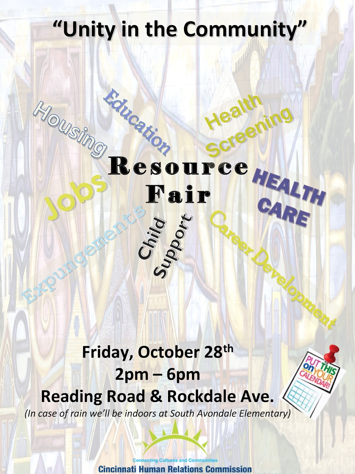 TODAY, Resource Fair, 2:00–6:00pm at the Corner of Reading Road & Rockdale Avenue in Avondale hosted by Community Outreach Advocate, Steven Sherman. CHRC’s Community Outreach Advocates (COA) are continuing to give back to the community and provide resources for assistance. In case of rain, the fair will be indoors at South Avondale Elementary School.